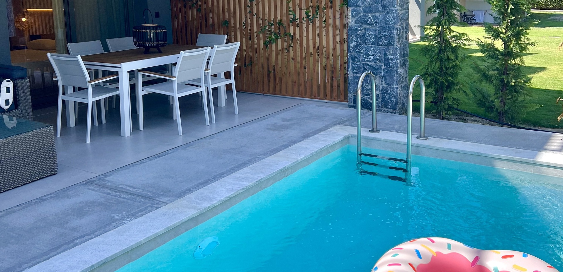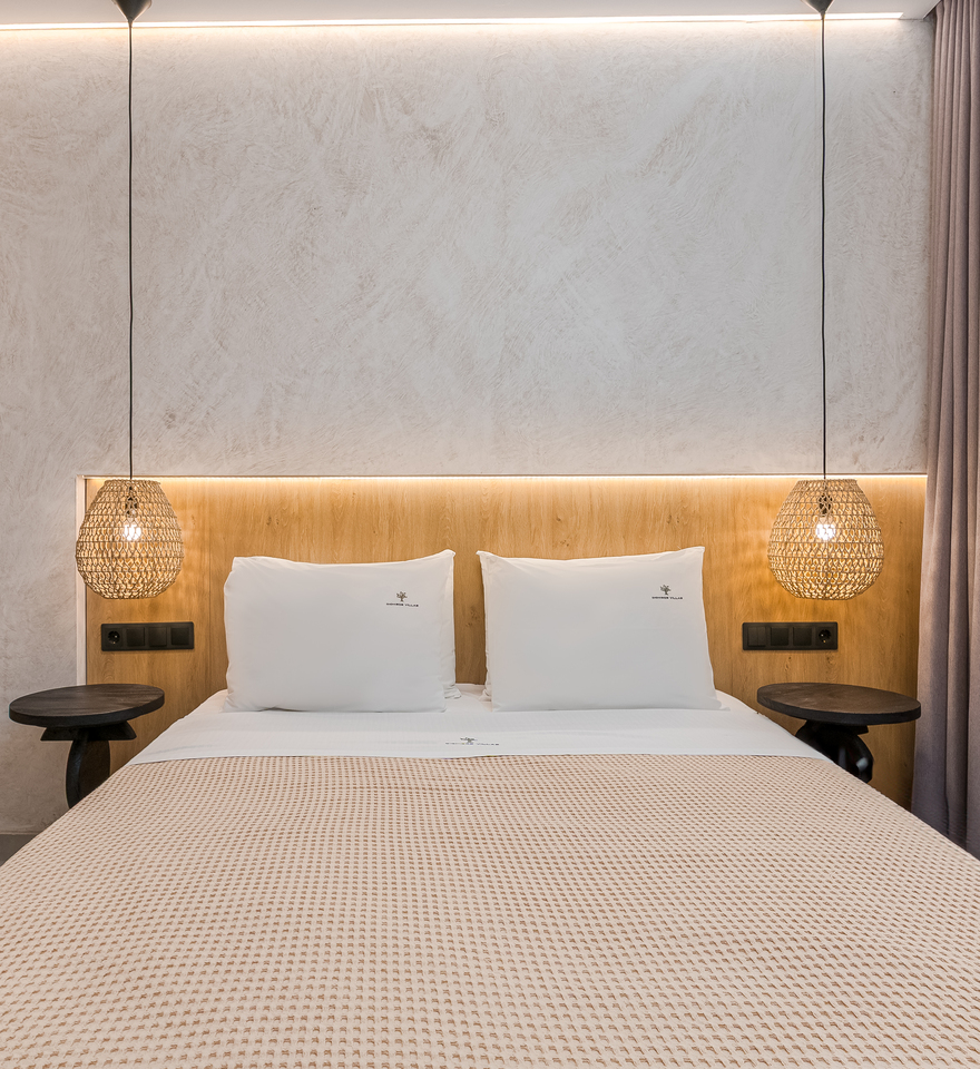 Our Luxurious Suite consists of two bedrooms, one bathroom, living room, fully equipped kitchen, balcony with couches, dining area and private pool with crystal clear waters. There is also a dishes washing machine and every room has its own separate air condition.